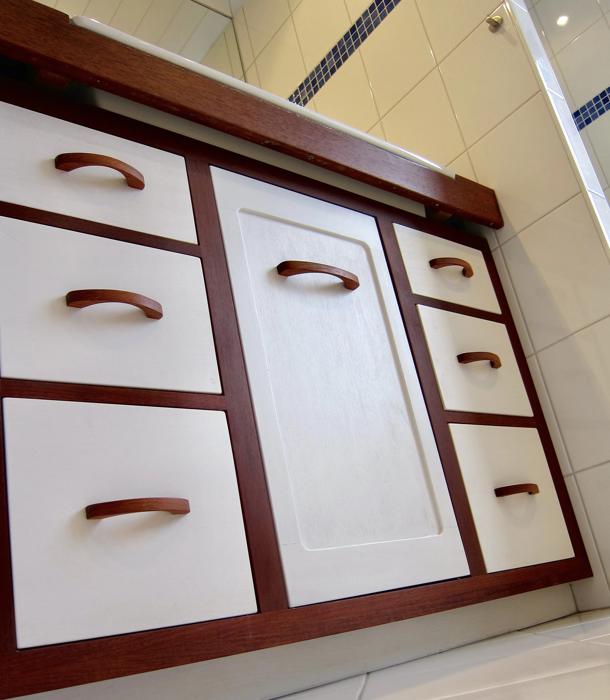 The sad sink that stopped working in this bathroom was an afterthought in need of an update. Rampant clutter has now been contained in self-closing drawers made mostly from oak flooring. Tung oil and a wide sink provide enough water resistance for family life. Reclaimed Santos mahogany’s natural color shines though, bringing bold contrast to an otherwise dull space. The wood is also incredibly hard and durable, making it a great option for this project.