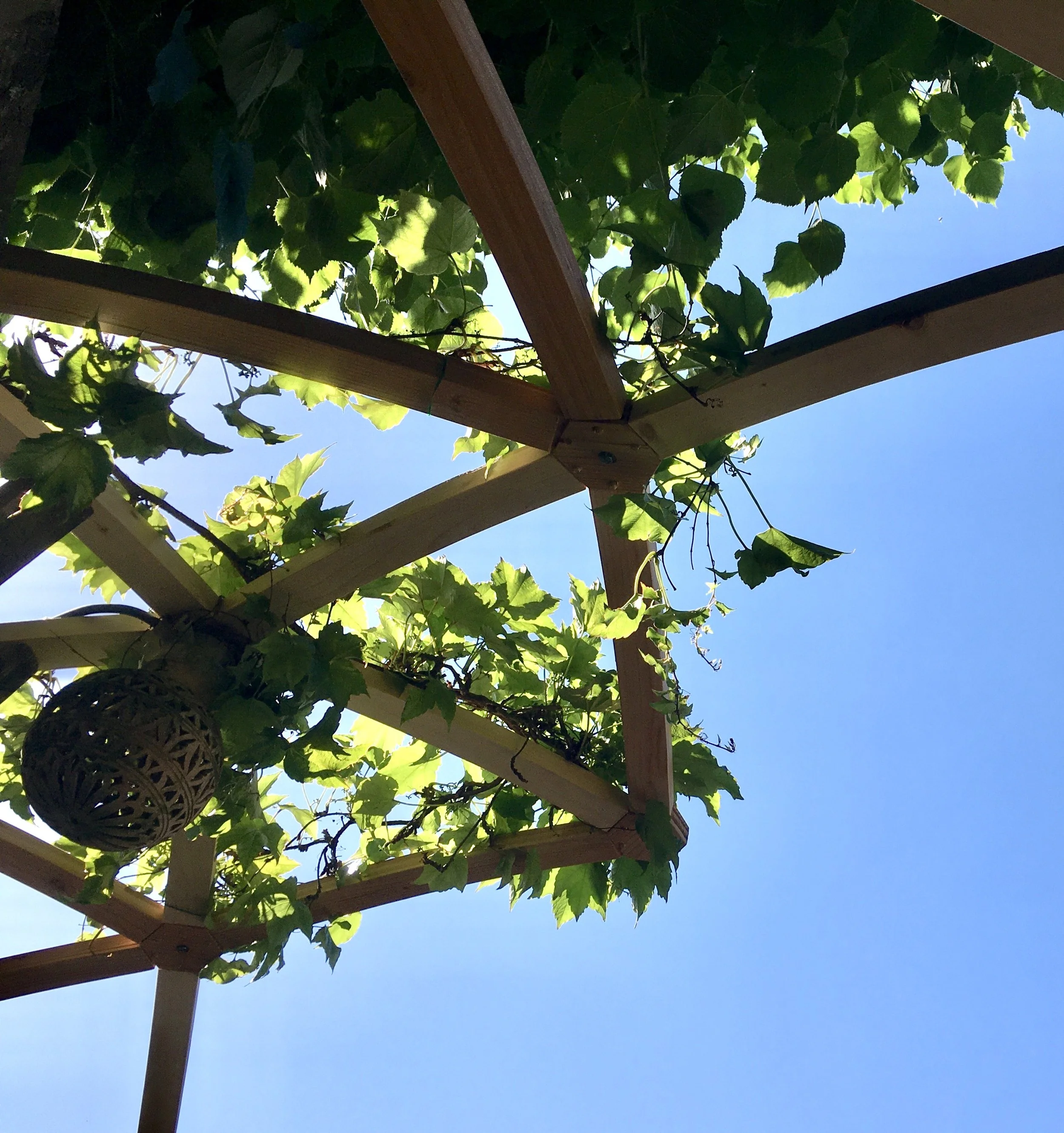 Using leftovers from a fence project and a tree that was recently cut, a rotting trellis was replaced with something a bit more eye-catching. By curving the struts, the dome shape itself became ‘depixelated’ and the finger joints in the hub connectors were simplified. Electricity and a light joined in alongside the grapevine. This was a good first draft in the long road to building domes to produce food.